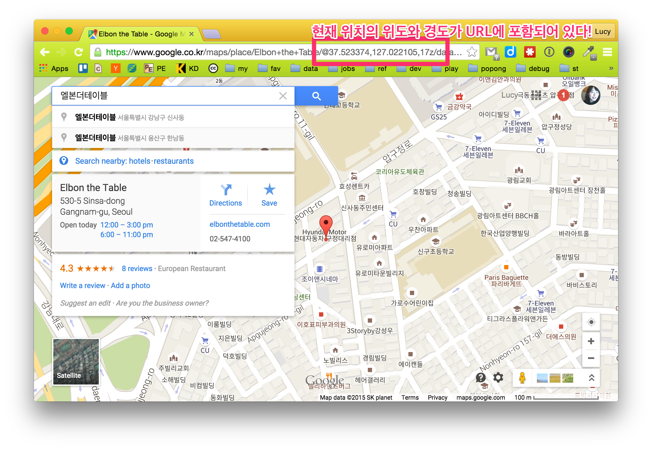찍으려는 좌표가 몇 개 안 되거나 찍고자하는 점의 주소를 구하지 못한 경우에는 수작업으로 위경도 정보를 얻는 방법도 있다. 일종의 꼼수지만, 다음과 같이 구글 지도에 상호명을 입력하면 대략적인 위경도 정보가 URL에 뜬다: